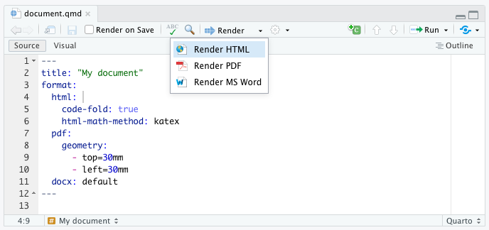 Render button also has a drop down menu that enables you to render to any of the formats listed in YAML front matter: