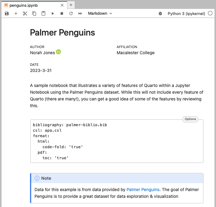 The Quarto extension, once installed, will automatically render the contents of markdown cells within your notebook. Cells without Quarto specific markdown will render normally, while cells containing Quarto specific markdown will show a preview of the content in a more usable form.
